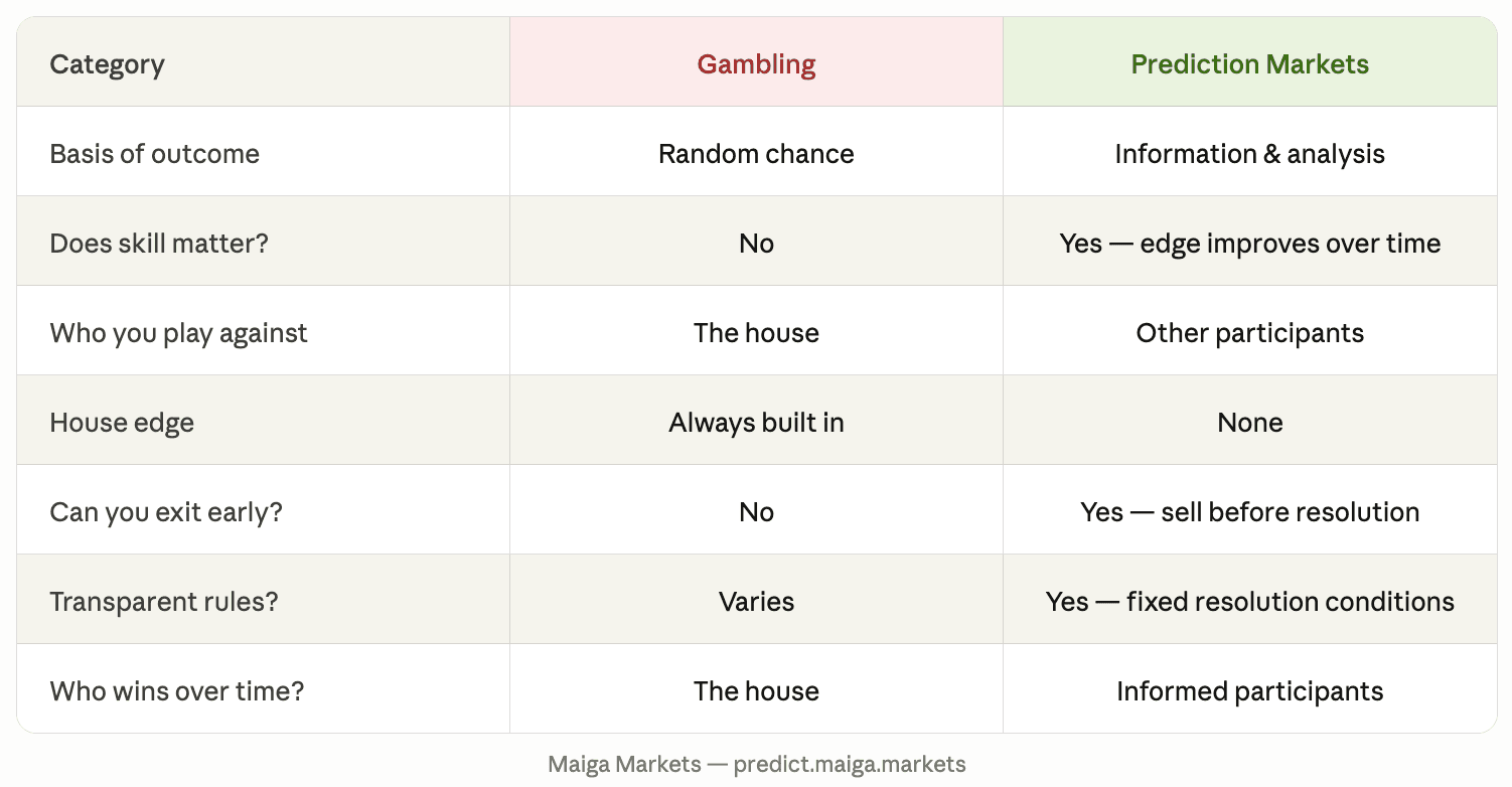 Gambling is designed around pre-determined randomness. Prediction markets are designed around information asymmetry. In gambling, the house always wins. In prediction markets, informed participants win over time.